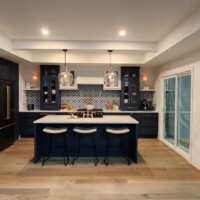 This sophisticated kitchen remodel features custom cabinetry, floating shelves, and stylish pendant lighting.